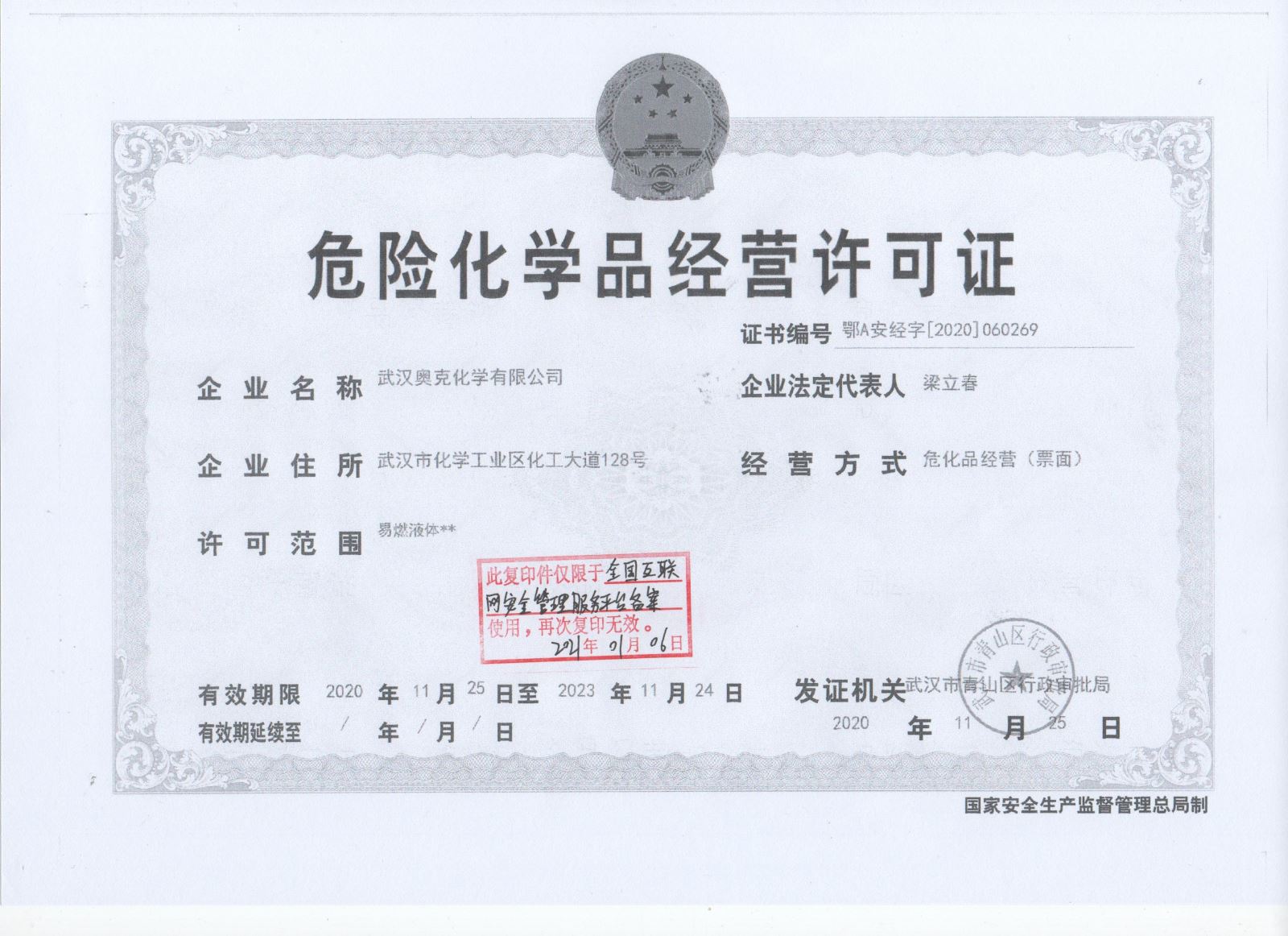 武漢奧克危險(xiǎn)化學(xué)品經(jīng)營(yíng)許可證